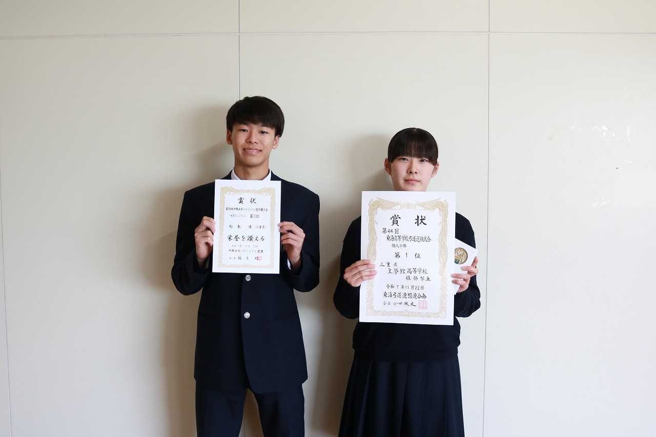 2025年12月8日 / 最終更新日時 : 2026年1月22日 皇學館高等学校同窓会 お知らせ 伝達表彰&海外語学研修について 伝達表彰が行われました、おめでとうございます。全国大会出場のクラブの皆さんは、これまでの努力の成果を発揮し、頑張ってきてください!また、海外語学研修の申し込みについて連絡がありました。今年度は台湾研修となります。生徒の皆さんには、それぞれのステージで幅広く知識や経験を得る機会になることを願っています。 薙刀部第34回三重県高等学校新人なぎなた大会兼第21回全国高等学校選抜なぎなた大会予選会 演技競技 3位 松島 咲来 齋藤 華 男子個人 優勝 西田 誌音 (全国選抜出場) 3位 浅井 隆之 増田 輝 団体戦 3位 バドミントン部 第78回中部日本バドミントン選手権大会一般男子シングルス第3位松本 准 弓道部 第44回 東海高等学校弓道選抜大会女子個人優勝服部 梨亜 囲碁・将棋部 第45回東海地区高等学校囲碁選手権大会女子団体戦第4位 吹奏楽部 伊勢市表彰 伊勢市民文化賞皇學館高等学校吹奏楽部 人権ポスター 令和七年度 明るい選挙啓発ポスターコンクール特選曽根 苺果 皇學館高等学校同窓会お問い合わせ・記事投稿フォーム 皇學館高等学校同窓会事務局 〒516-8577 伊勢市楠部町138(皇學館高等学校内) ☎ TEL 0596-22-0205 お問い合わせ・記事投稿はこちらから コメントを残す コメントをキャンセルメールアドレスが公開されることはありません。 ※ が付いている欄は必須項目ですコメント ※ 名前 ※ メール ※ サイト Δ