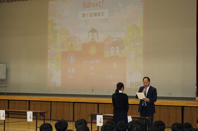 2026年3月12日 / 最終更新日時 : 2026年4月8日 皇學館高等学校同窓会 お知らせ 1学年レクリエーション「雑学王決定戦」開催! 今年度最後の1学年レクリエーション!盛り上がった「雑学王決定戦」 今年度も残りわずかとなりました。1学年では最後を締めくくる行事として、クラス対抗クイズ大会「雑学王決定戦」を行いました。 今回のクイズ大会は、教育用アプリ「Kahoot!」を使用。リアルタイムで順位が変動するスリル満点の展開に、会場となった体育館は熱気に包まれました。 各教員が作成した教科別クイズでは、授業で習った知識を総動員する場面も。「えっ、そうだったの?」「やった、正解!」と、あちこちで笑顔が弾け、終始和やかな雰囲気に包まれました。 学年主任からのエール 大盛況のうちに全プログラムが終了し、最後には学年主任からこの1年間を振り返るメッセージがありました。 入学当初の初々しい姿から、行事や日々の学習を経てたくましく成長した現在の姿まで、1年間の軌跡を振り返る言葉に、生徒たちは真剣な表情で聞き入っていました。 皇學館高等学校同窓会お問い合わせ・記事投稿フォーム 皇學館高等学校同窓会事務局 〒516-8577 伊勢市楠部町138(皇學館高等学校内) ☎ TEL 0596-22-0205 お問い合わせ・記事投稿はこちらから コメントを残す コメントをキャンセルメールアドレスが公開されることはありません。 ※ が付いている欄は必須項目ですコメント ※ 名前 ※ メール ※ サイト Δ